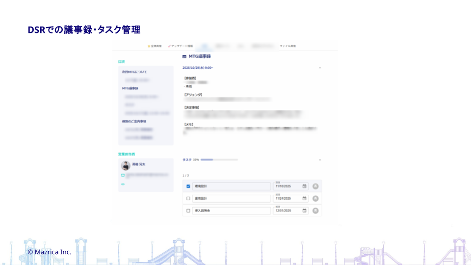定例MTG後は、決まった内容を資料にまとめ、次のアクションを共有。DSRでタスク管理することで認識のズレなく進められる体制をつくっています。