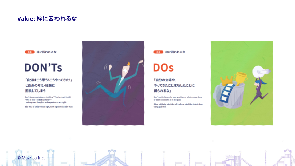 その中でも、CSMとして日々大事だと実感しているのが「枠に囚われるな」と「コミュニケーションを諦めない」という2つのバリューです。