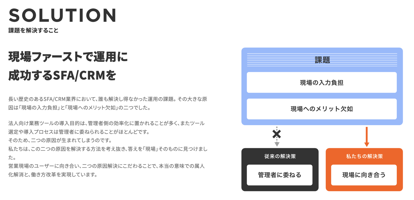 そこで、何か良い打開策はないかと調べていたら、情報の蓄積や成功事例の共有を可能にするSFA/CRMに出会って「まさに、これだ!」と。