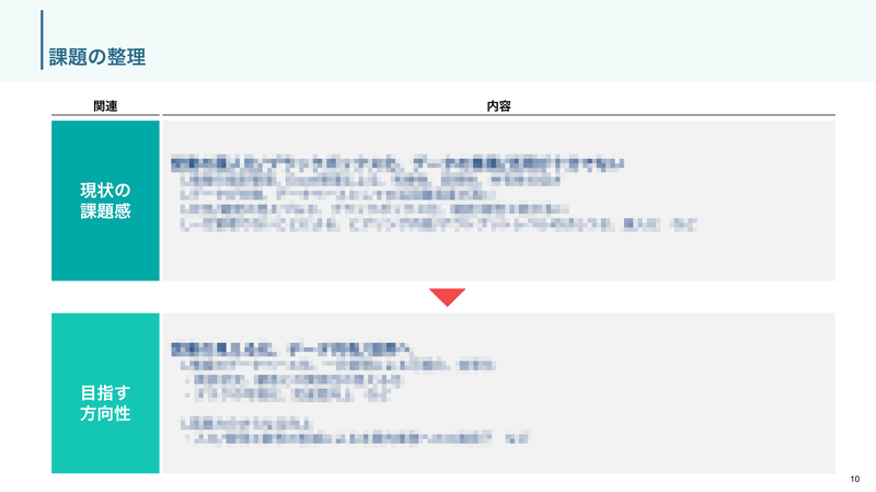 「課題の整理」パートで確認した目指す方向性に向けて、どのようなステップを踏んでいくのかについてイメージのすり合わせを行います。