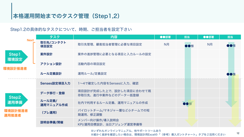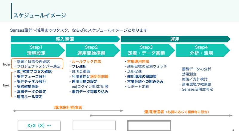 プロダクトの導入〜利用定着〜活用までにやるべきことと、大まかなスケジュール感について確認しています。