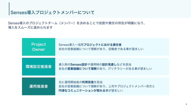 プロダクト導入のプロジェクトチーム(メンバー)を決め、役割や責任の所在を明確化することによって、導入をスムーズに進められます。