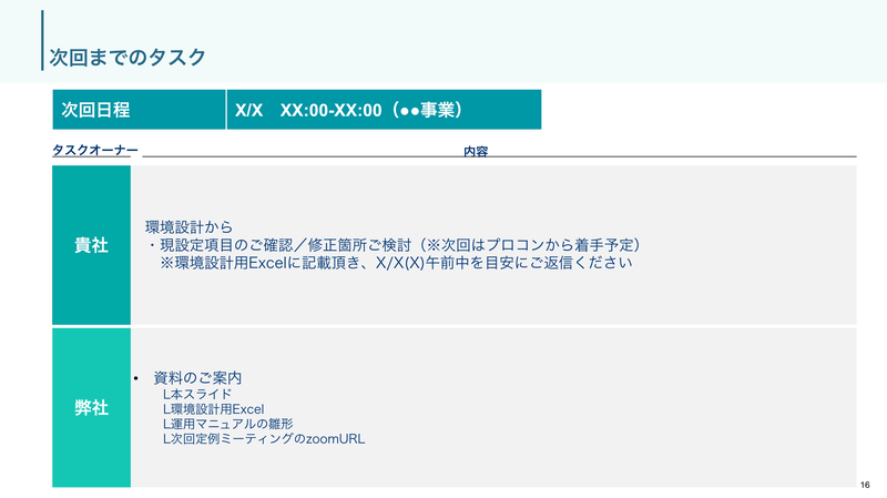 「困ったときは何を(どうやって)見ればいいのか」をご理解いただくことで、次回ミーティングまでのタスク進捗がスムーズになります。