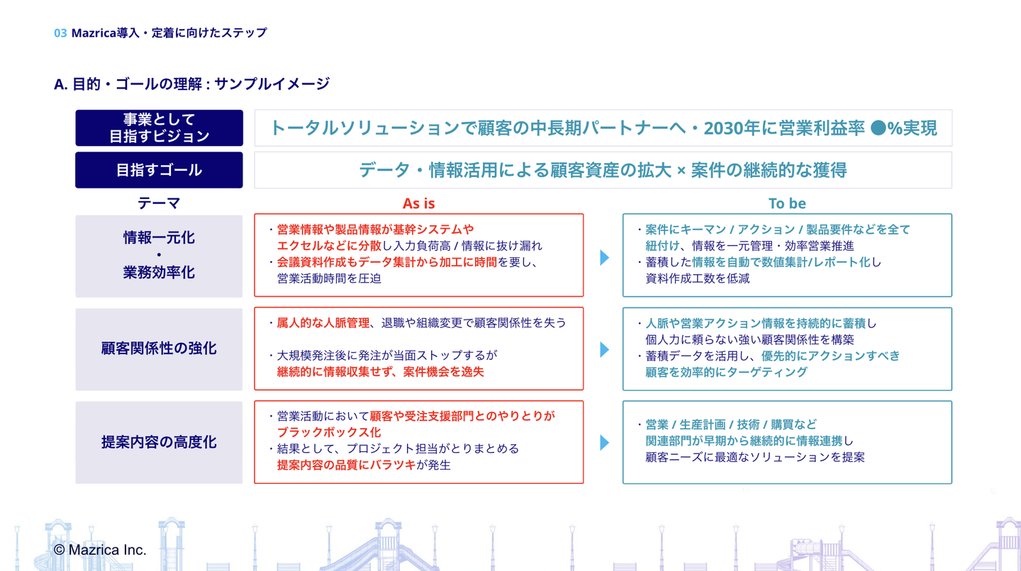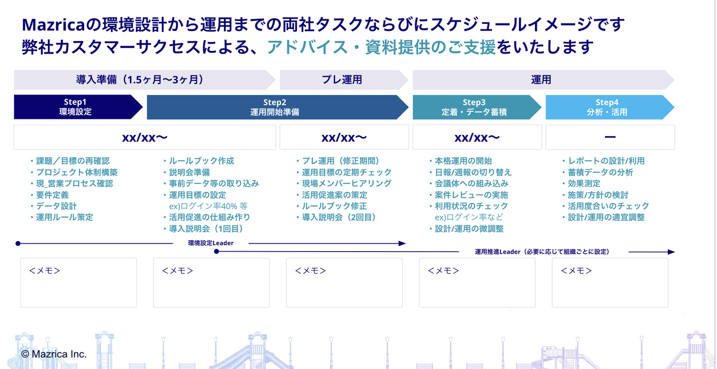 まずオンボーディング支援に関してですが、Mazricaを効果的に活用していただくために弊社ではご契約開始時に実施する「キックオフミーティング」に注力しています。