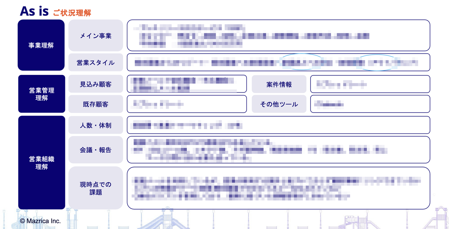 弊社プロダクトMazricaの活用を通じた、お客様の営業・マーケティング領域における成果創出の伴走支援を行なっております。