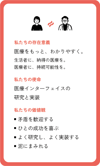 生活者と医療者の共通領域に機能する「医療インターフェイス」が私たちの研究と実装の対象です。両者のコミュニケーションをわかりやすく、スムーズで心地よい体験にしていく。そのためにプロダクトをつくり、改善を繰り返す。「つくること=完了」ではなく社会実装までやる。それが私たちの責務であり、生活者と医療者が共創する医療をレイヤードはつくっていきます。