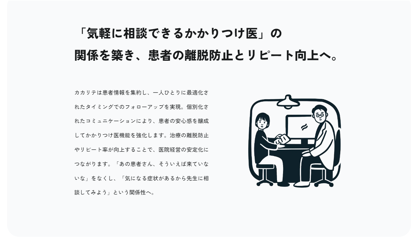 Kakarite(カカリテ)は医療者と患者のより良い関係性をつくるPRM(患者関係性管理)です。患者情報を集約し、患者1人ひとりに最適化されたフォローアップを行うツール。かかりつけ医機能を強化し、治療の離脱防止やリピート率向上に貢献。医院経営の安定をサポートします。