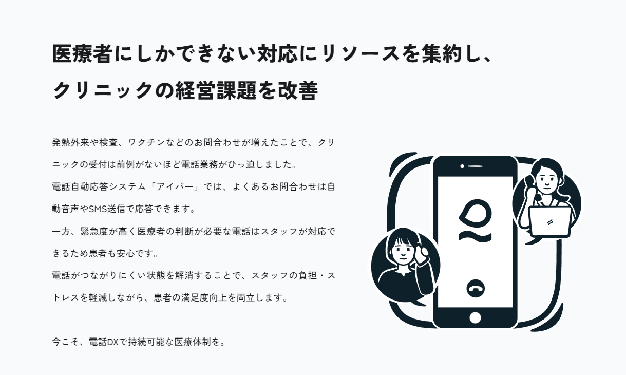 クリニックの受付業務に特化した電話自動応答システム「アイバー」は、コールセンターのように自動音声ガイドやプッシュ操作で電話の自動応答を可能にするIVRクラウドサービス。レイヤードは電話DXで持続可能な医療体制の実現を目指します。
