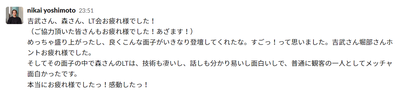 LTの一人目は社内から森さんが登壇してくれた。LLMを使ったWebアプリ開発の話をしてくれて、勉強になったし、盛り上がっていい空気を作ってくれた。続いた登壇者の方々もうまく話を盛り上げていただき、1回目の弊社のイベントに花を添えていただけた。