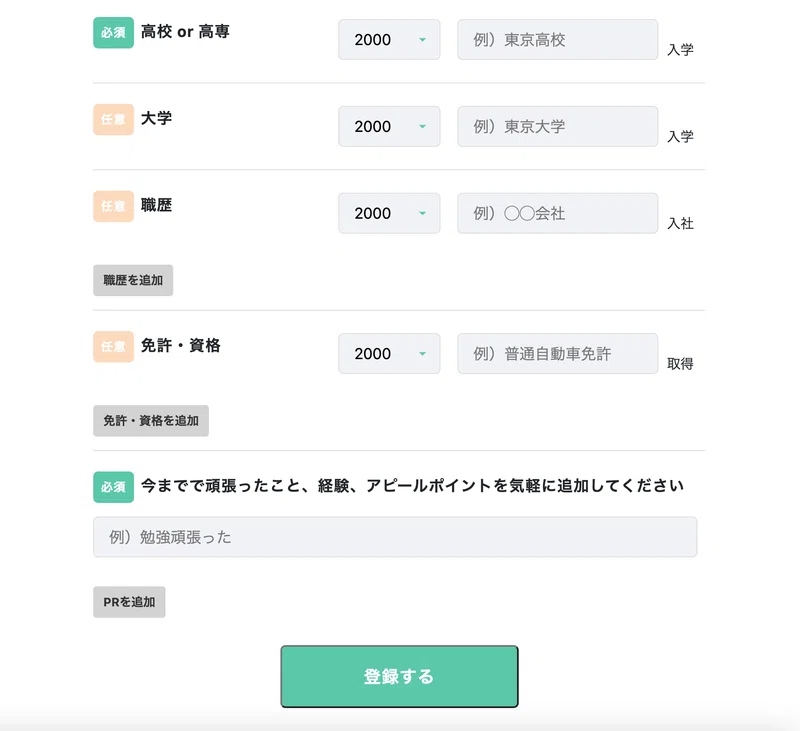また、今まで頑張ったこと、経験、アピールポイントを気軽に追加してください。の欄を埋めるとChatGPTによって自己PRが自動生成される仕組みになっています。