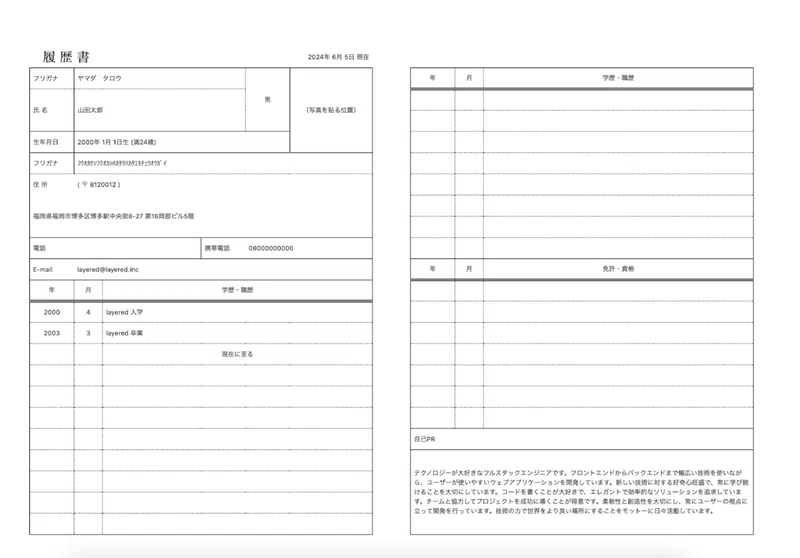 個人情報のフォームを登録し、「登録する」ボタンをクリックすると下記のように履歴書が自動生成されるようになっています。