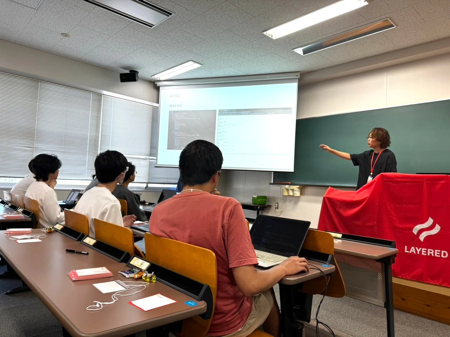 大学では、HTMLやCSSを授業では使わないとのことで、講義とハンズオンを交えながら開催しました。