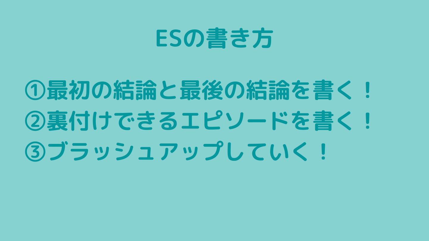 ESでは、端的に自分の魅力を伝えることが求められます。そのため、最初の文と最後の文を読んだだけでどんな人間なのかがわかるようにしなければなりません。