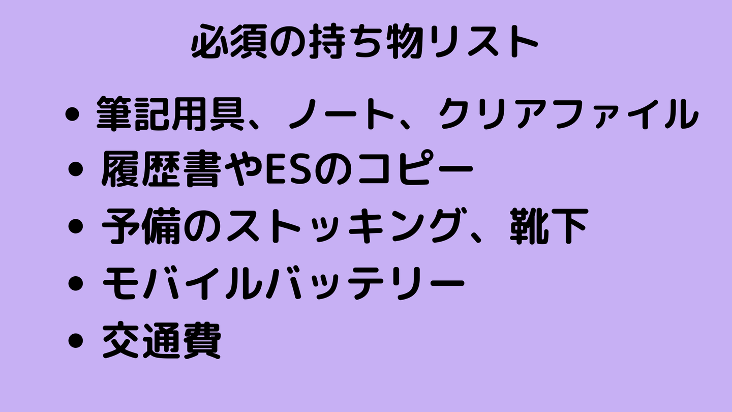 対面の場合、家から離れた場所まで行くので、起こり得ることを想定して持ち物リストを作成しましょう。備えあれば憂いなし!気持ちの余裕をもって出発したいですよね。