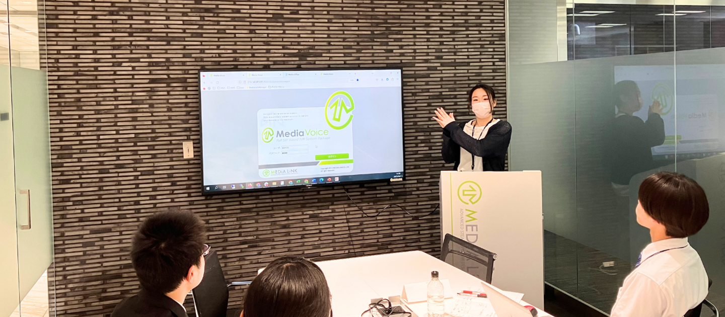 事業部勉強会にて事業を理解した状態で、自社プロダクトであるテレフォニーシステム「Mediaシリーズ」、チャットボット「MediaTalk」について、実際に体験しながら学ぶプロダクト研修も行いました。