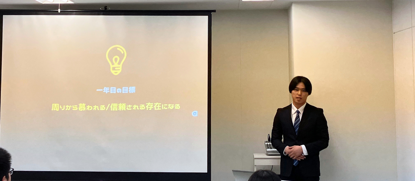 先輩たちのプレゼンを聞いた上でいち社会人として、いちメディアリンク社員として何をすべきかを考えてもらい、社長の前で1年間の目標と決意表明をしてもらいました!