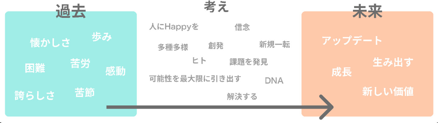 「過去」から「未来」に向かってmediba独自の「考え」を持って歩んでいくというものです。これをもとに3つのコンセプトを作成しました。