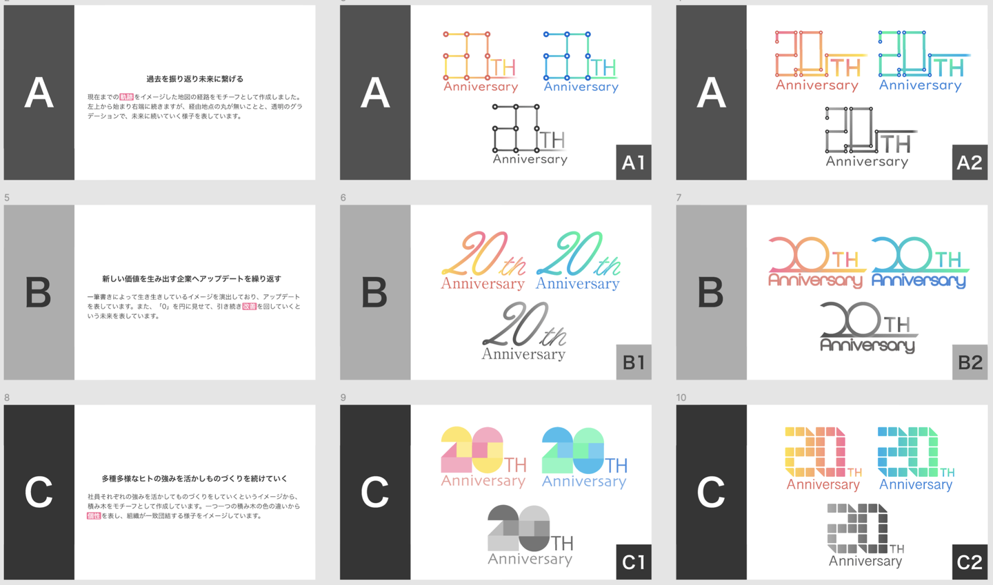 審査しやすいようコンセプトとデザイン案をスライドにまとめ、A1〜C2の中から投票を行いました。