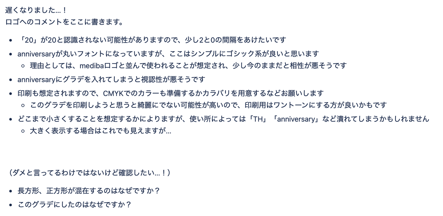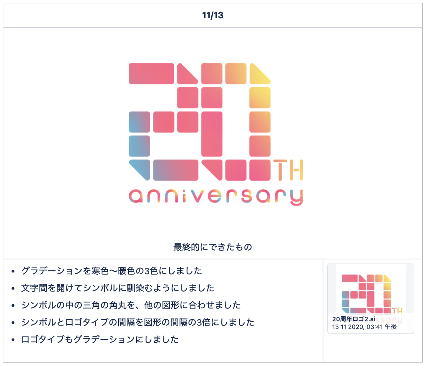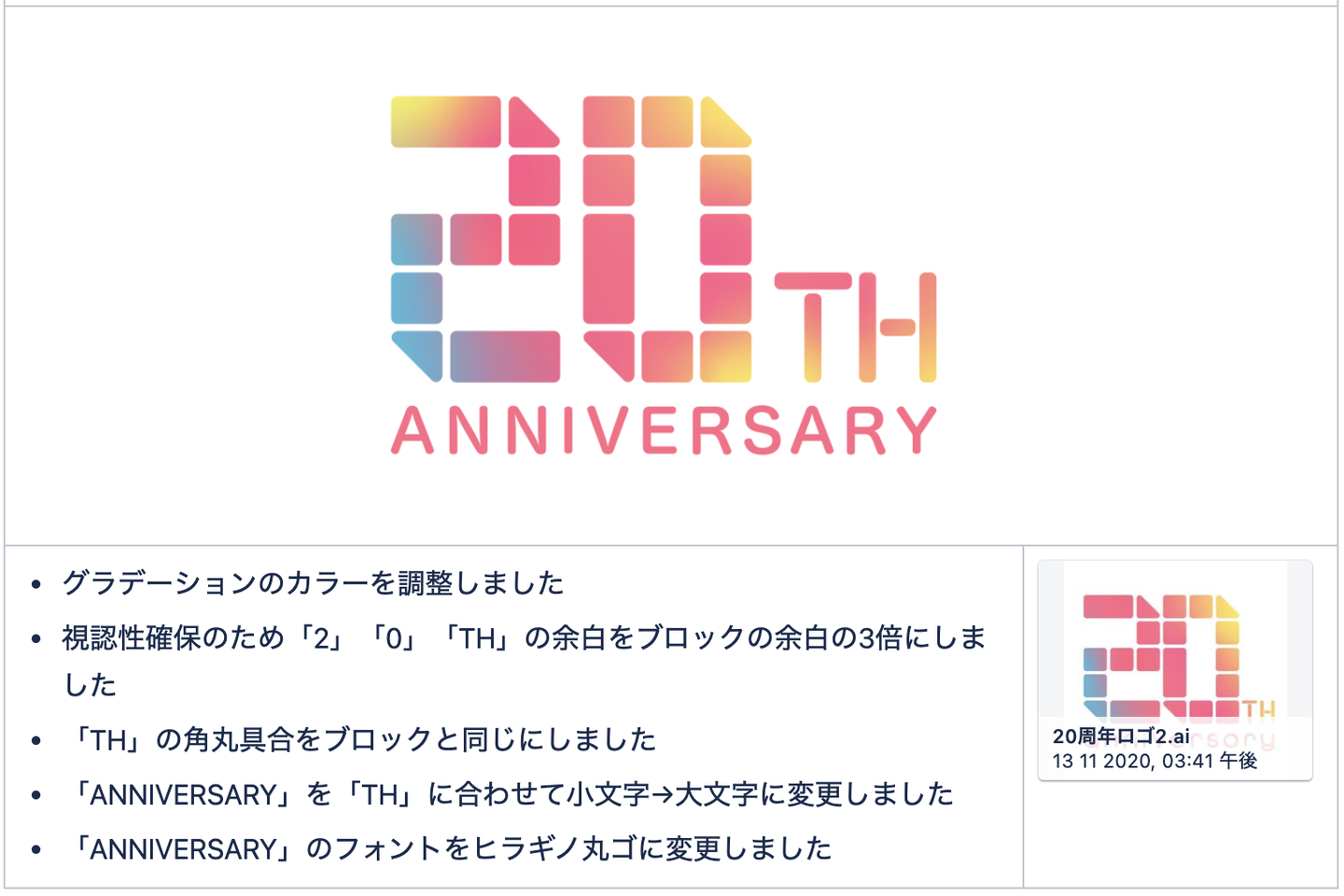 直球の質問だけでなく、20周年に関する質問をいくつか設けることで、ロゴへ込めたい思いをしっかりと聞かせてもらうことができました。感謝です。