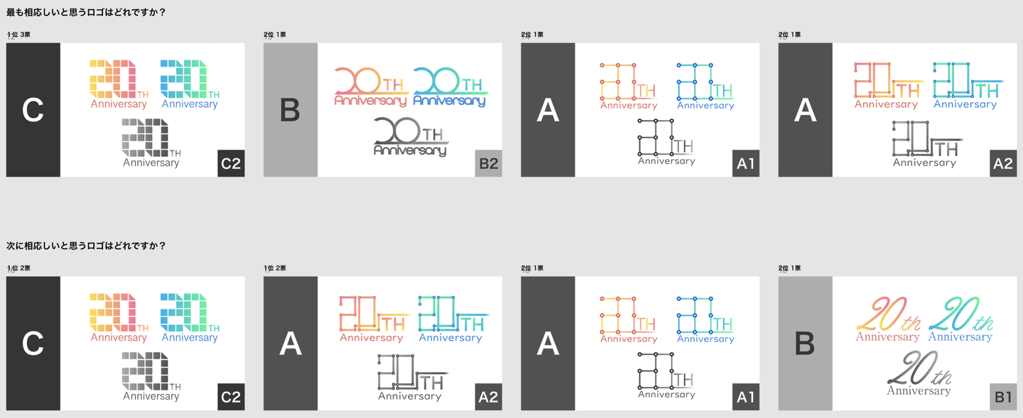 6つのラフデザインのロゴから20周年プロジェクトの関係者の方々に投票をしてもらい、投票結果がこちらです。