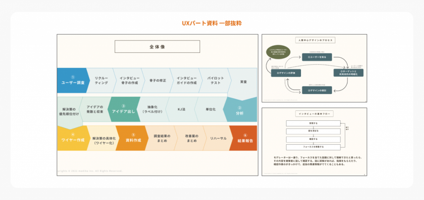 今回はUX/UIチーム合同での実施ということで、まずmedibaとして何をアピールすべきか(何が強みか)を話し合った結果、数年前から力を入れている「人間中心設計をもとにしたものづくり」に。