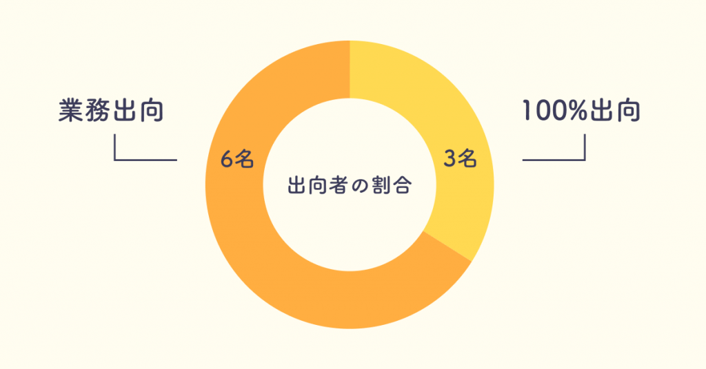 現在の出向者は全部で9名(2022年3月29日現在)。100%出向者と兼務出向者の割合は以下の通りです。