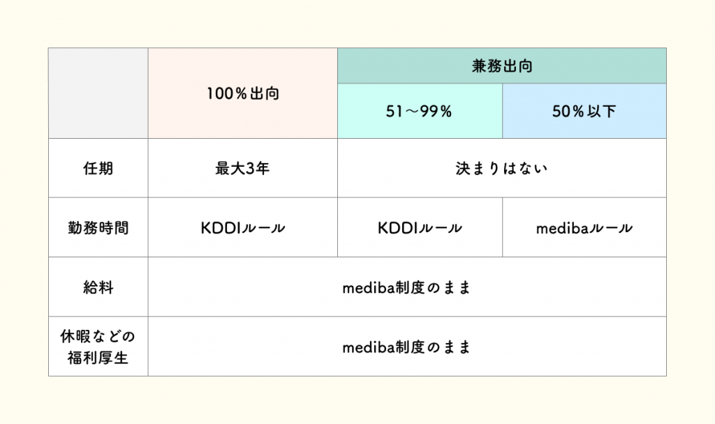 出向には大きく分けて2パターンあり、ひとつはKDDIの業務だけを行う100%出向で、もうひとつはmedibaでの業務も継続して行う兼務出向。この2つは制度的にも違いがあります。