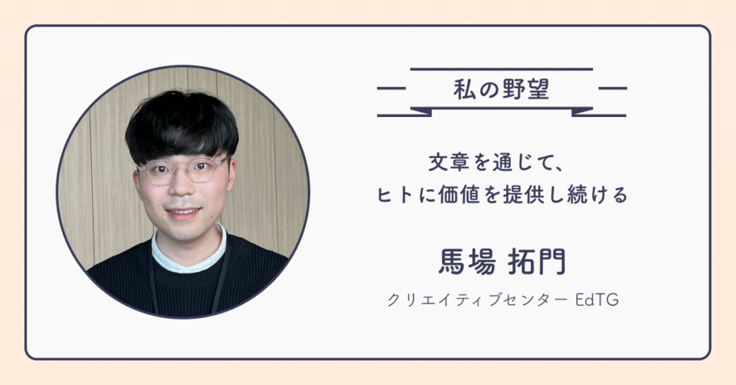 ラストは、テクノロジーセンター配属のA.Y.さん、柿本侑毅(かきもと ゆうき)、そしてクリエイティブセンター所属で筆者の馬場拓門(ばば たくと)の3名。それぞれの野望についてご紹介します。
