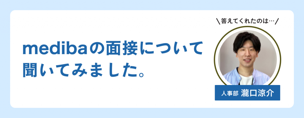 新卒・中途問わず、medibaの採用試験を受けてみたいと思っている方の中には、「採用基準が知りたい」「面接時の服装は?」など、面接について色々と知りたい方もいらっしゃると思います。そこで今回は、人事部の瀧口涼介(たきぐち・りょうすけ)にそんな面接の気になる疑問に答えてもらいました。