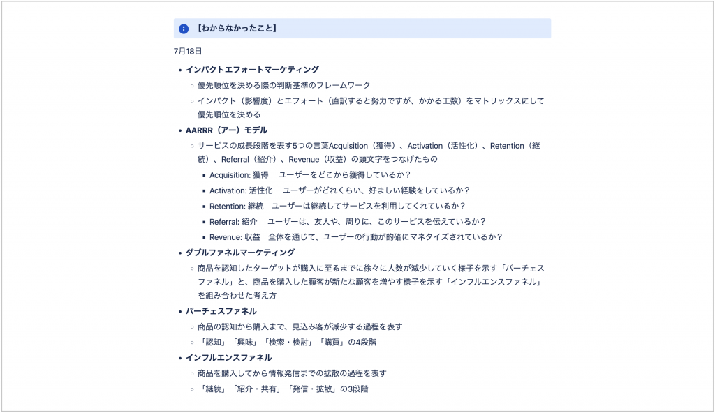 まずひとつ目が議事録の作成。週に1回行われるミーティング内で、議論の内容や決定事項を記録していきます。配属当初は知らない単語が議論のなかで飛び交っていたので、議事録を取ると同時にそれらをメモし、ミーティング後に調べてサービスの理解を深めていましたね。