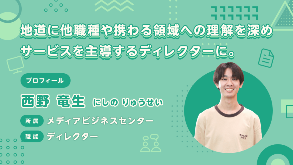 第2回は、ディレクターの西野 竜生(にしの りゅうせい)と小泉 紗羅(こいずみ さら)。配属当初から試行錯誤を重ねるふたりのリアルをお楽しみください!