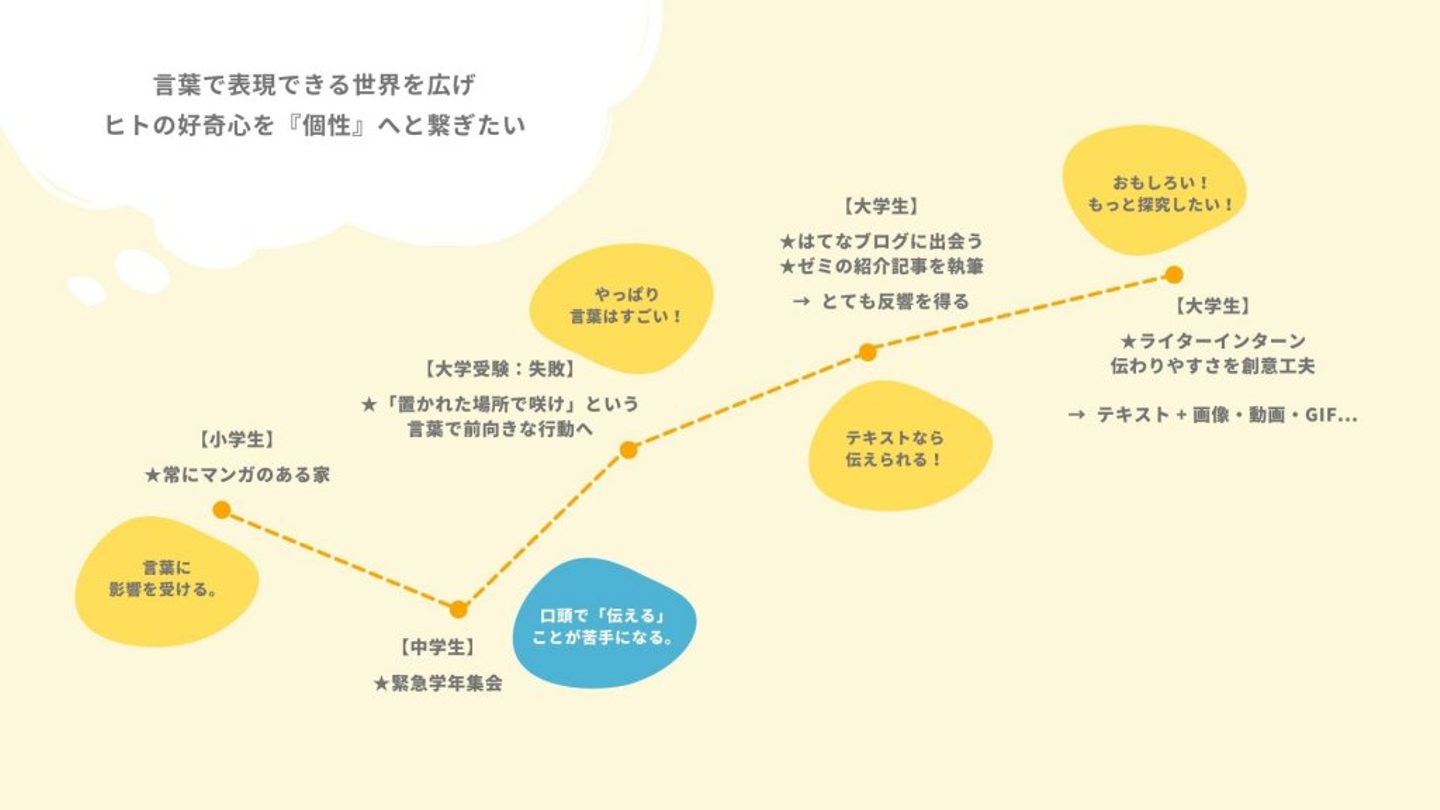 私にはもともと「言葉で表現できる世界を広げたい」という想いがありました。その想いのもと、学生時代は個人ブログや長期インターンでライティングの経験を積み、徐々にエディター職に興味を持つようになりました。