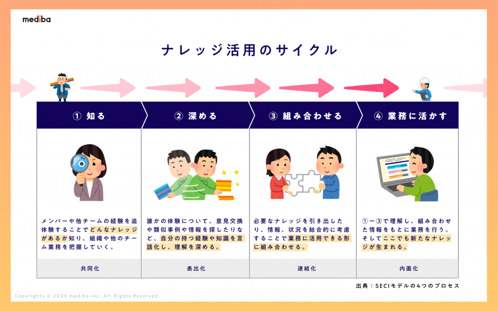 大きな枠組みとしては、ナレッジを体系化しながら共有して使えるようにしていく取り組みの一環となります。ナレッジ活用のサイクルを「知る」、「深める」、「組み合わせる」、「業務に活かす」という4つに分けて考えて、その最初のナレッジを知る・深めるフェーズとして存在しています。