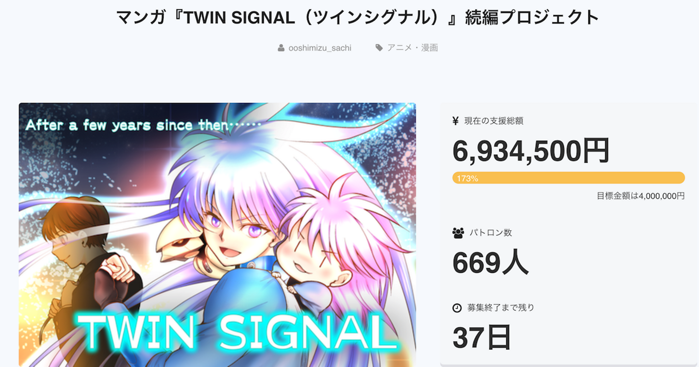 マンガ『TWIN SIGNAL』続編クラウドファンディングプロジェクト(5月30日まで)が、4月19日開始半日で目標金額の4,000,000円を達成しました!