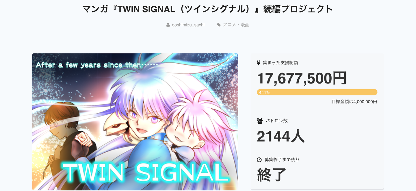 5月30日23:59、CAMPFIRE×MediBang『TWIN SIGNAL』続編制作プロジェクトが目標を大きく上回りフィニッシュしました! 大清水さち先生念願の『TWIN SIGNAL』続編『TWIN SIGNAL Biennial(バイエニアル)』の執筆が実現します!