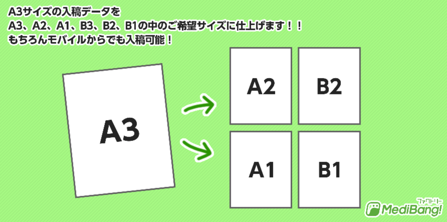 500円から作れるアイテム作成サービス「 メディバンファクトリー 」にて「ポスター印刷」の販売を開始しました! A3,A2,A1,B3,B2,B1サイズのポスターが作成できます。 大型のインクジェット印刷機で印刷するため、コピー用紙のような薄い紙ではなくしっかりとし厚さのある用紙に印刷されます。 用紙は 写真の印画紙のような光沢のある「光沢フォト紙」 程よい光沢と落ち着いた質感の「半光沢フォト紙」 光沢のない白みの強いマット紙の「インクジェット厚手コート紙」 からお選びいただけます。 ・しっかりとした厚手