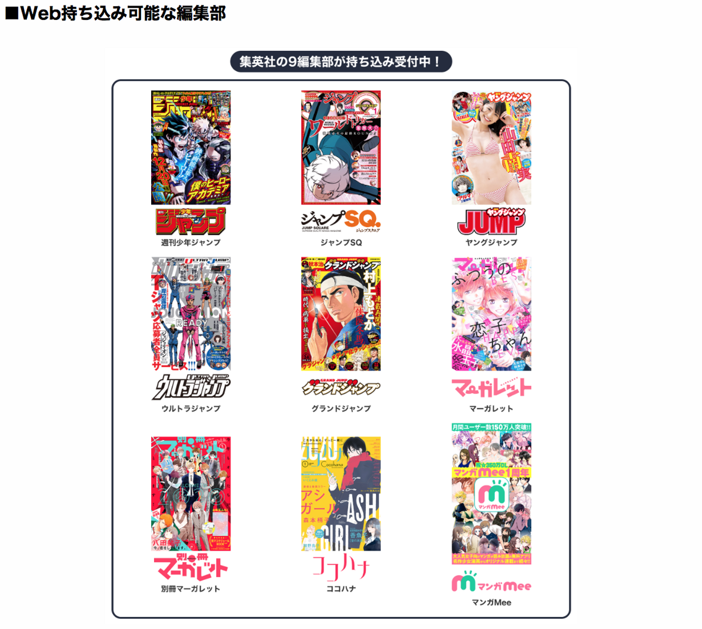週刊少年ジャンプ、ジャンプSQ.、ヤングジャンプ、ウルトラジャンプ、グランドジャンプ、マーガレット、別冊マーガレット、ココハナ、マンガMeeの9編集部が受付中です。