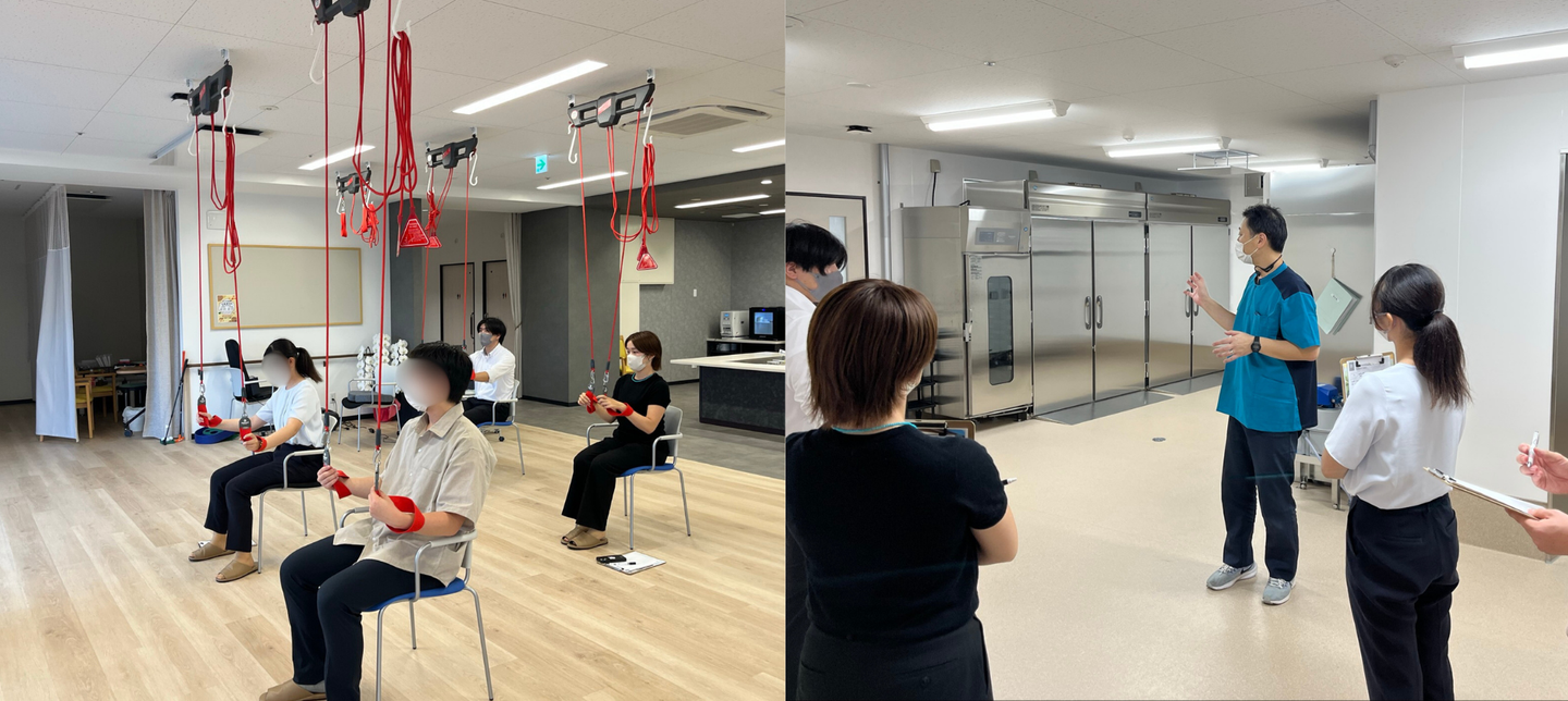 ☝デイサービスで使用しているレッドコード(専用ロープを用いた運動プログラム)を体験したり、ニュークックチルの設備を見たりしました!