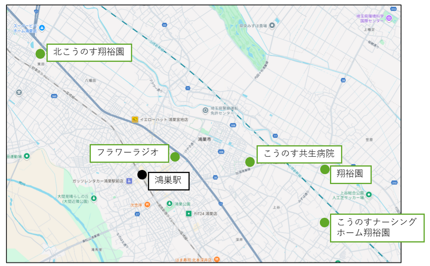 埼玉県には非常にたくさんのGenki Group拠点がありますが、特に鴻巣市にはさまざまな施設が密集しています。グループ初の介護施設である翔裕園が鴻巣市に開設したので、以降さまざまな施設がこの地に作られました。鴻巣市には、介護施設はもちろんのこと、病院・歯科クリニック・就労支援施設・学校・ラジオ局などが車で数分で行ける範囲に集まっていて、互いにシナジーを生み出しながら街全体で"より良い"生活を実現しています。