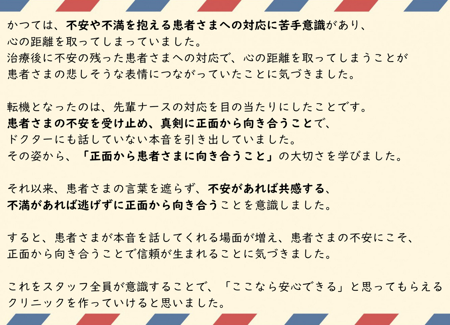 2.美容医療ミッションやクレド※への理解・共感・体現ができるチーム・