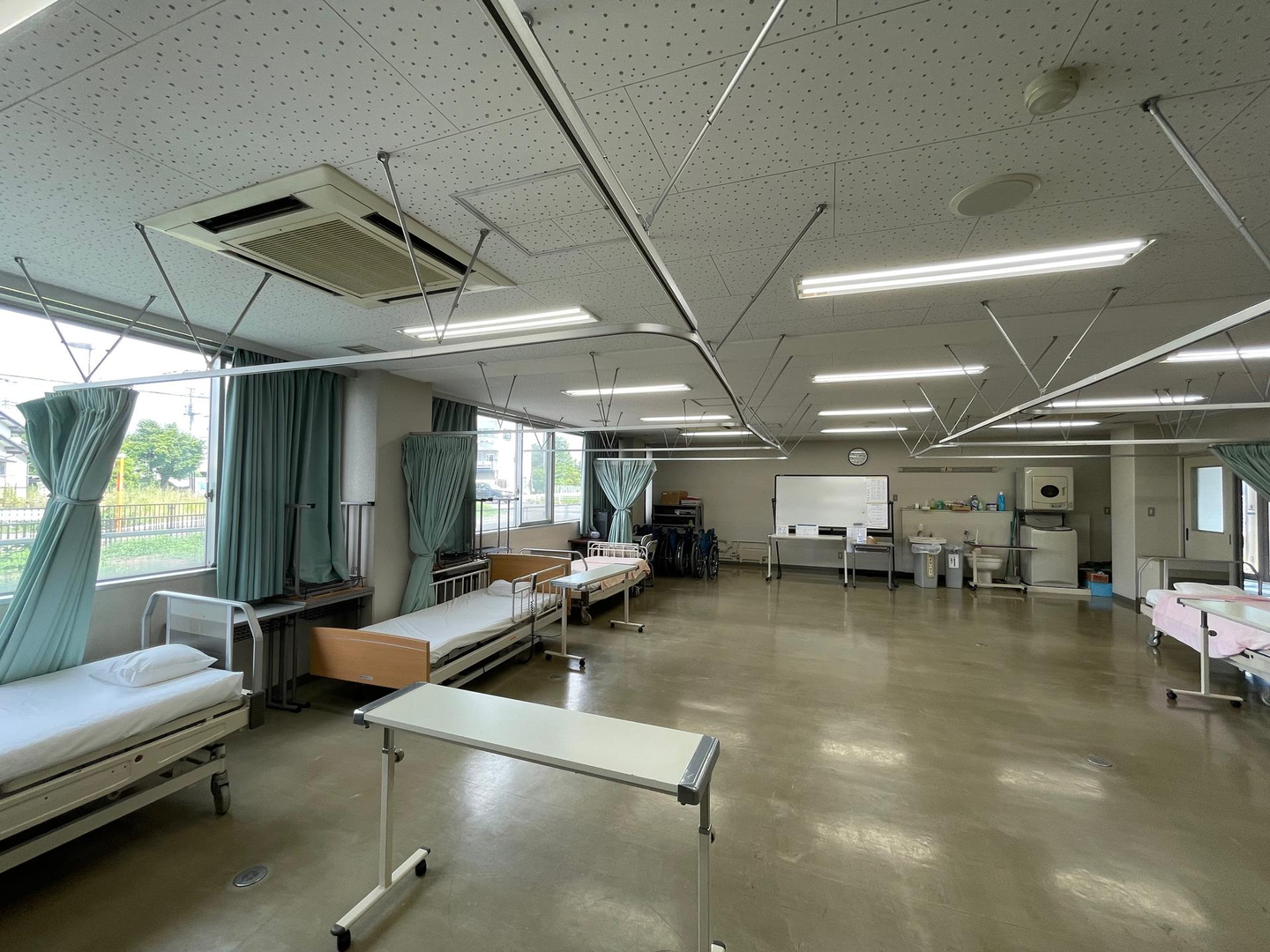 ☝こちらは実習室です。ベッドや車いすを使いながら、実践的な介護技術を学ぶことができます。普段はベッドが中央に並んでいるのですが、学校説明会で車いす体験会を行った関係で端に寄せているそう。