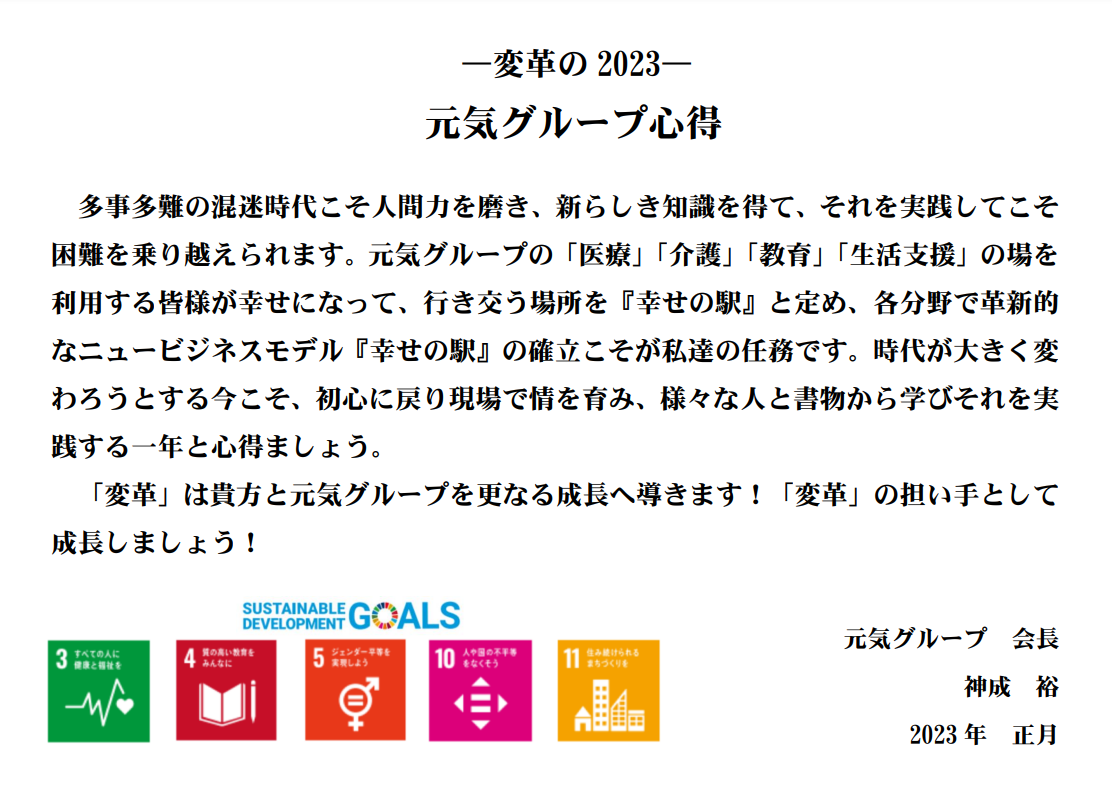 「Genki Group は創業の想いである『共に生きる』を大切にして、どんな時でも誰かの幸せのために人を世の中を元気にする存在でありたい。そして、人の幸せが集まる駅でありたい。コロナ禍であっても、さまざまな大変なことがあっても私たちは明るさと元気で、地域を、人を照らす存在でありたい。」