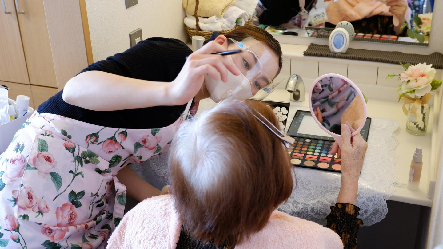 内田)よろしくお願いいたします!簡単に言うと、外部のプロであるケアビューティストさんに施設へ来ていただいて、ご利用者さまにフェイシャルトリートメントやハンド・フットトリートメントを提供したり、女性の場合であればメイクも提供したりしようという取り組みです。格好も昔着られていた思い出の服装に着替えて、施設に用意したフォトスポットで写真を撮る。これが一連の流れですね。