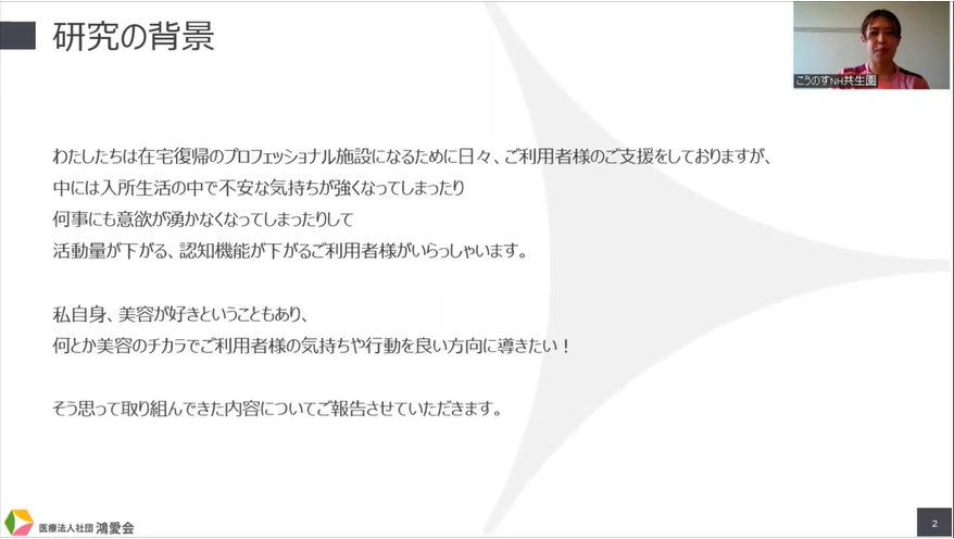 この記事でご紹介するのは、毎年Genki Groupの介護領域が一堂に会して実施している高齢者介護研究会(通称:ケア研)にて2022年度の優秀賞を受賞された、こうのすナーシングホーム共生園の『気持ちと行動を変える美容アプローチを目指して』という取り組みです。