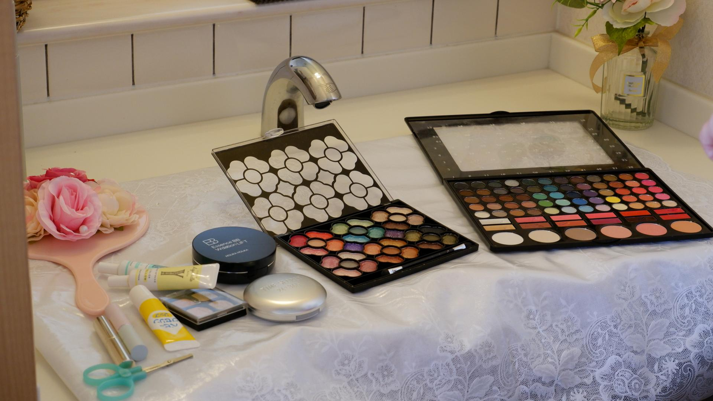 ☝メイクパレット。自己決定力の維持も兼ねて、お好きなお色を選んでいただくとのこと。セラピーの最初から置かれていて、視覚的にも楽しんでいただけるようにしています。