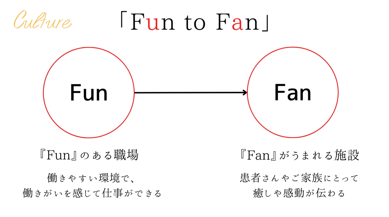 内田)一番大事なのは職員が楽しそうに目の前の患者さまのために一生懸命になれるような仕組みを作ることですね。職員が目の前の患者さまに一生懸命になればなるほど患者満足度(CS)が上がるし、そうするとどんどん患者体験(PX)が変わっていく。だからこそ「Fun to Fan」を掲げ、病院の環境改善のほか、教育体制や福利厚生制度構築にも力を入れています。