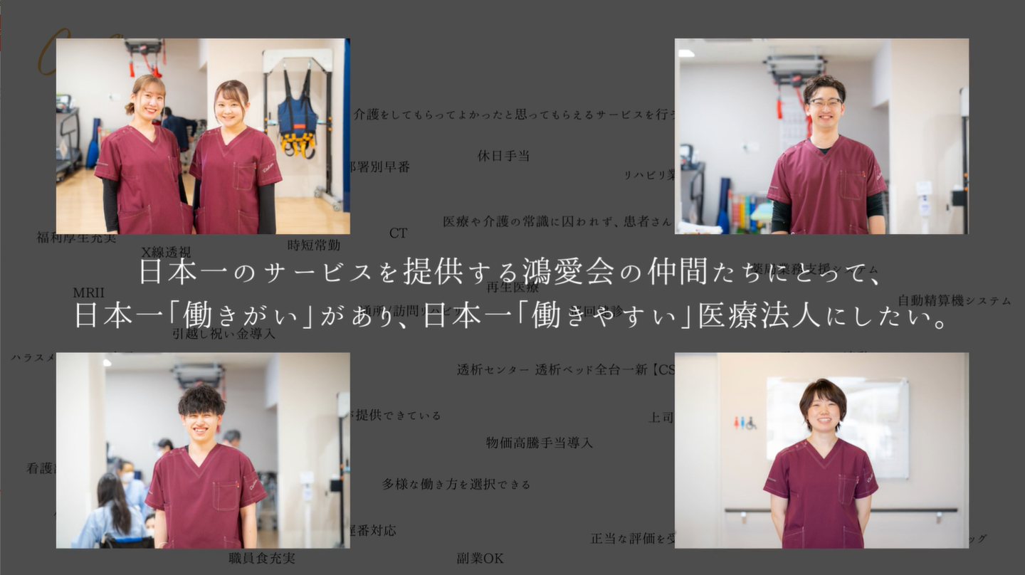内田)「鴻愛会は日本一の医療サービスを提供している病院であり、日本一働きやすく働きがいのあふれる職場である」という状態を作りたいなと思っています。将来2040年を視野に入れたときに、人材の取り合いは間違いなく起こる。そうなったときに、当然ですが良い人を採用できる医療法人が良い医療サービスを提供できるようになるんですよね。そのころには「え、こうのす共生病院で働いてんの??すごいじゃん羨ましい」と界隈で言われるような法人になっていたいですね。