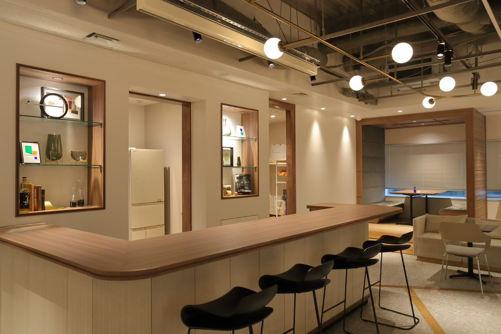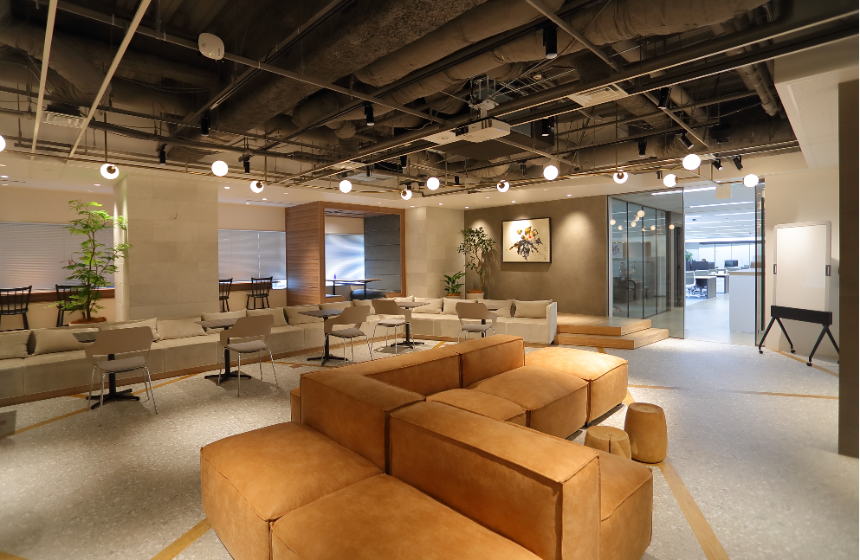 ☝おしゃれなデザインにワクワクが止まりません。「働きに来たい、楽しいと思えるオフィス」を目指し、壁には「楽」の文字が。