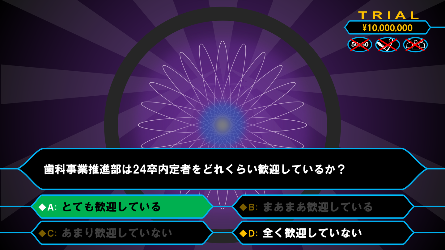 👆某4択クイズ番組をモチーフに、歯科事業推進部の廣松さんがアイテムを使いながら正解!^^
