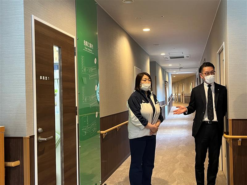 👆施設長(写真左)とメディケア・リード・ジャパンの山口社長(写真右)に案内していただきました。